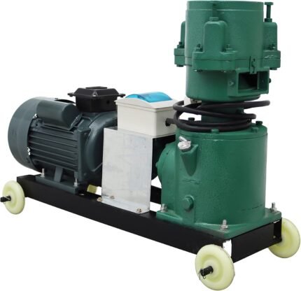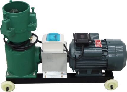 The machine is made of steel with a painted finish, ensuring durability. Large feed inlet and outlet facilitate feeding and discharging. Wheels at the bottom facilitate movement.