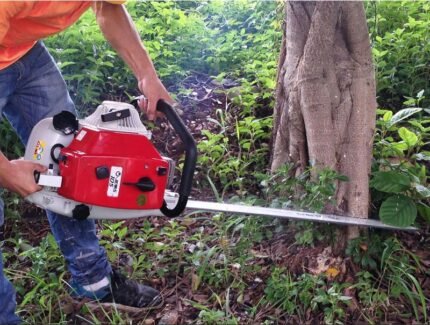 A large-displacement engine delivers powerful cutting force. This large-displacement gasoline engine provides exceptional power and torque, performing outstandingly in all forestry operations, from felling hardwoods and quickly cutting large trunks.