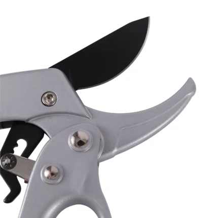 A safety lock button allows for easy and safe opening and closing of the shears for pruning.