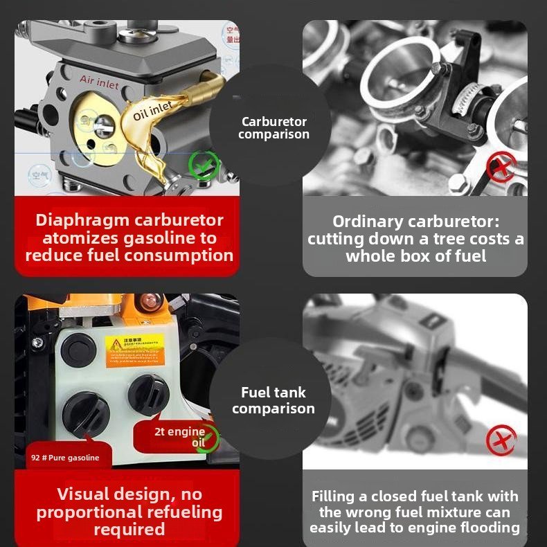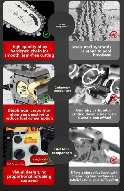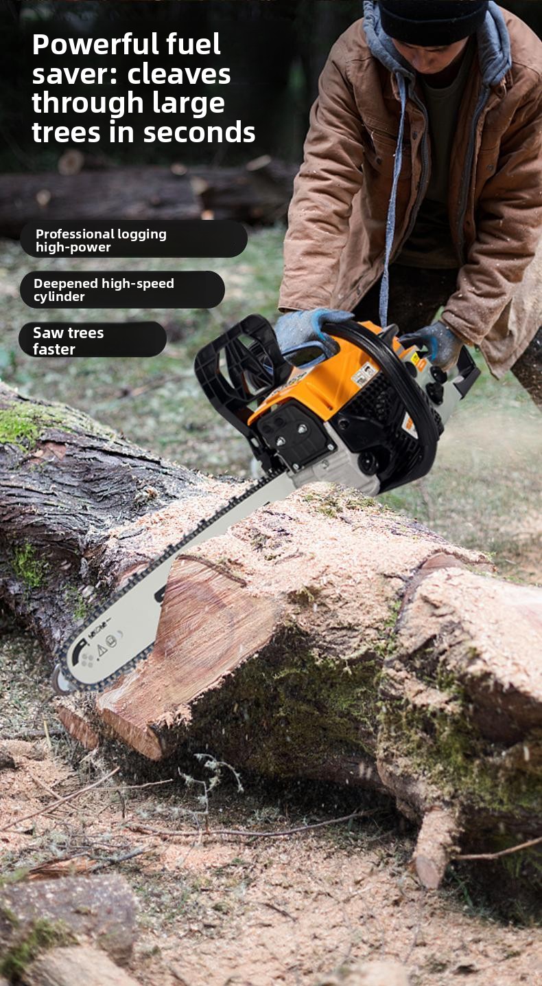 Easy-Start Chain Saw: Quickly start the saw with a simple pull. Gently pulling the chain back instantly stops the saw, ensuring safer operation. This chainsaw is suitable for a variety of work conditions.