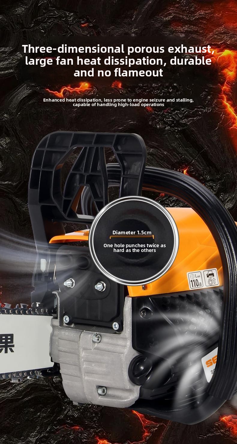 Powerful Chain Saw: Professional logging equipment with high power and powerful thrust. Its deep, high-speed cylinder significantly improves work efficiency. Three-dimensional, multi-hole exhaust and a large fan for heat dissipation ensure durability and flameout resistance. The titanium alloy chain is wear-resistant and durable, and the lightweight design makes it easy for both elderly and women to use.