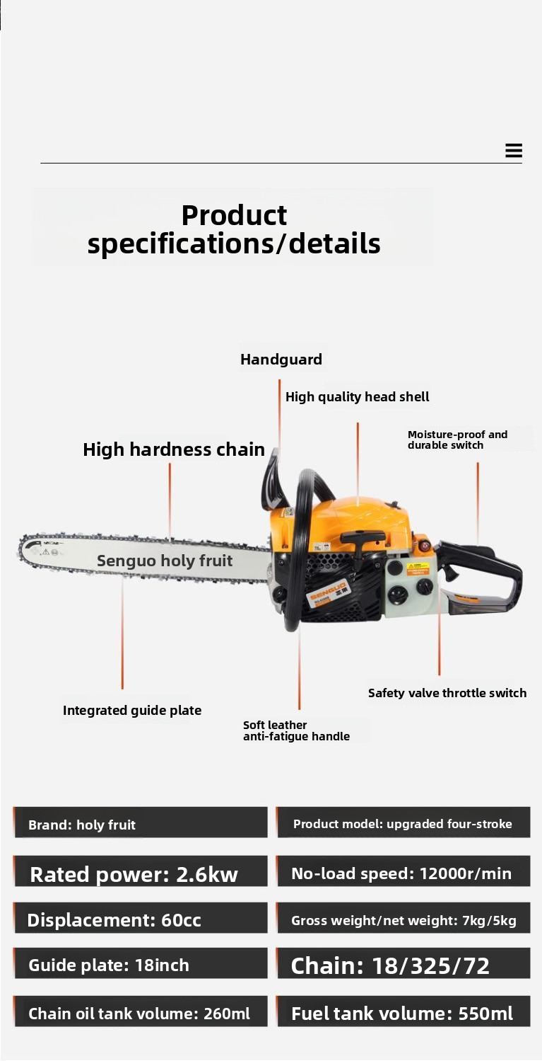 Displacement: 60cc, Power: 2.6kW, 18-inch guide bar, Net weight: 5kg.