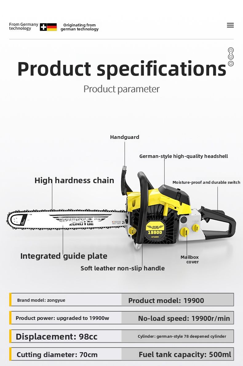 Upgraded chainsaw: 19900w power, powerful enough to handle all kinds of hard wood, German (78) double-slot cylinder, doubles work efficiency, lightweight design, even the elderly and women can work easily. Specially equipped with high-hardness quenching chain, long service life and not easy to break. Gasoline and engine oil are refilled independently without the need for mixing, and start and brake quickly. Product parameters: Upgraded 19900w, displacement 98cc, cutting diameter 70cm
