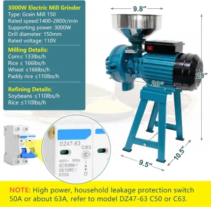 High-quality materials: This 3000w grain mill is constructed of premium materials, capable of grinding up to 80 mesh, ensuring quality and durability. The capacitor housing is made of high-quality aluminum alloy, making it resistant to breakage during transport and rust-resistant.