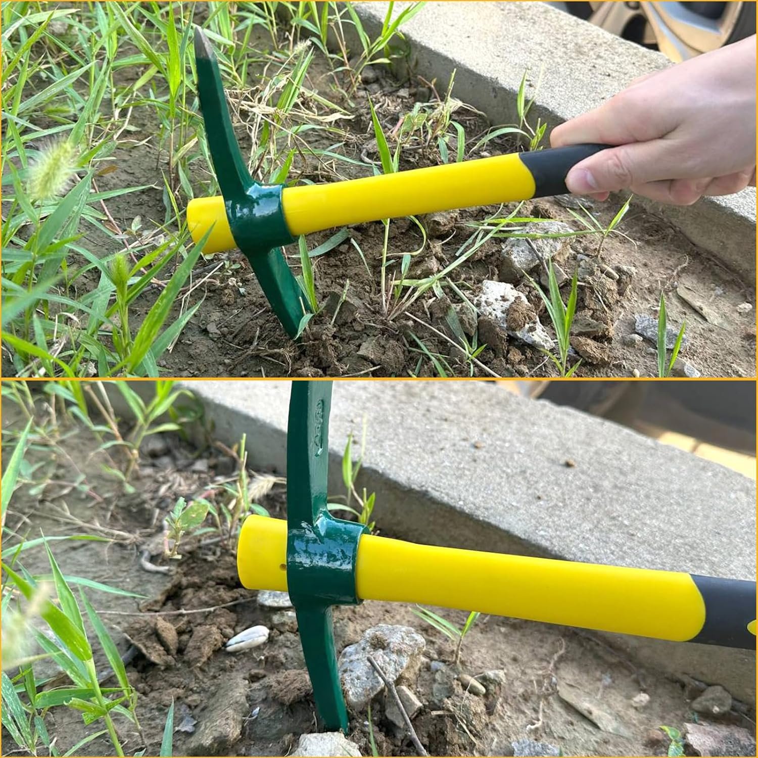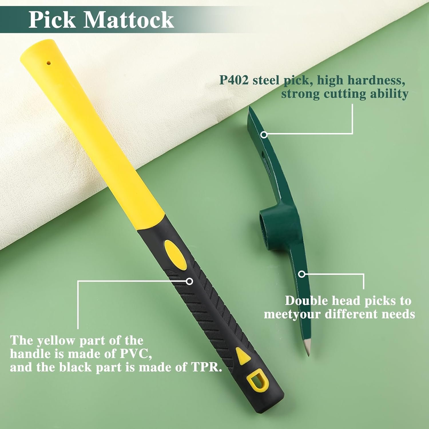 Uses: The pointed end is used for breaking gravel and hard, dry soil, as well as rocky surfaces; the flat end is used for digging or loosening soft soil. It is an ideal tool for landscaping, planting, ditching, tilling, weeding, and felling, suitable for various gardening tasks and maintenance.