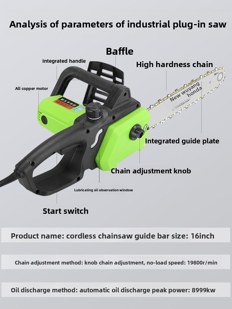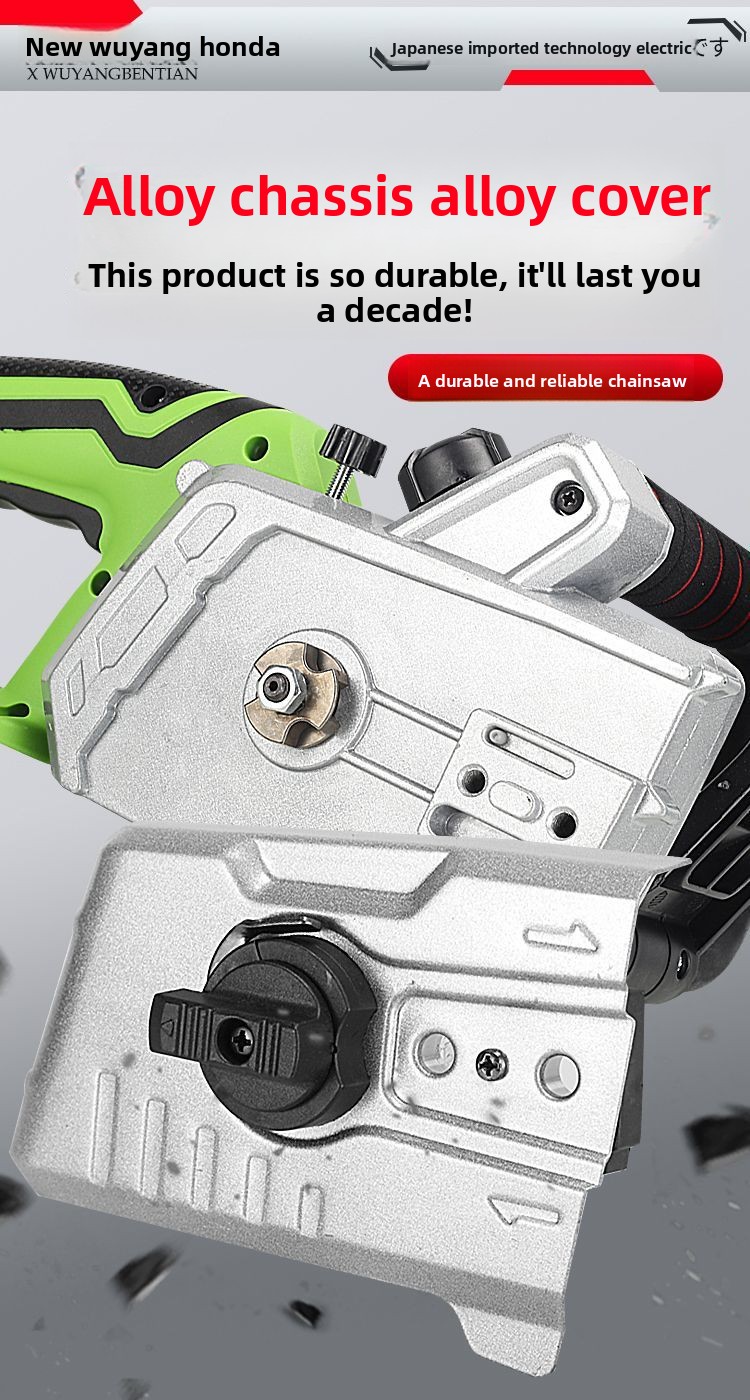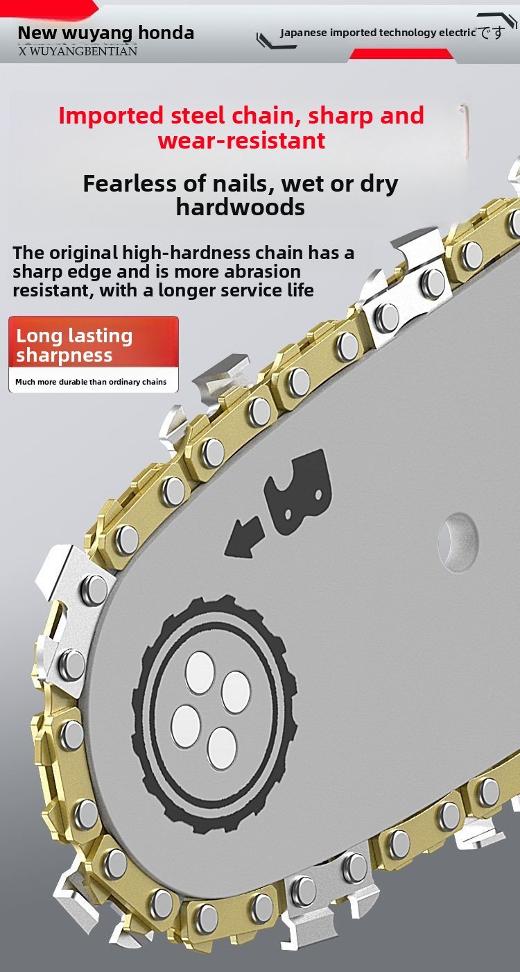 Plug-in chainsaw: Alloy chassis and cover, automatic oil-lubricated chain guides reduce wear and extend service life. High-hardness chain is sharp, wear-resistant, and has a long service life.