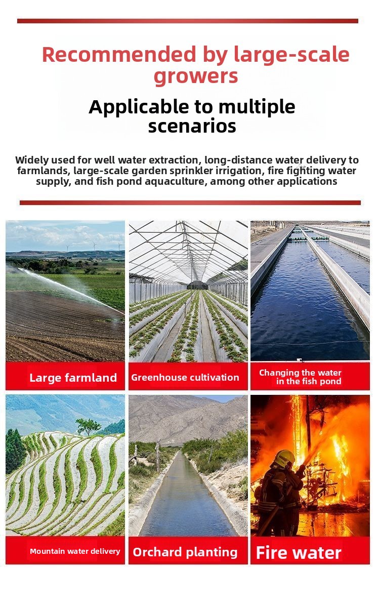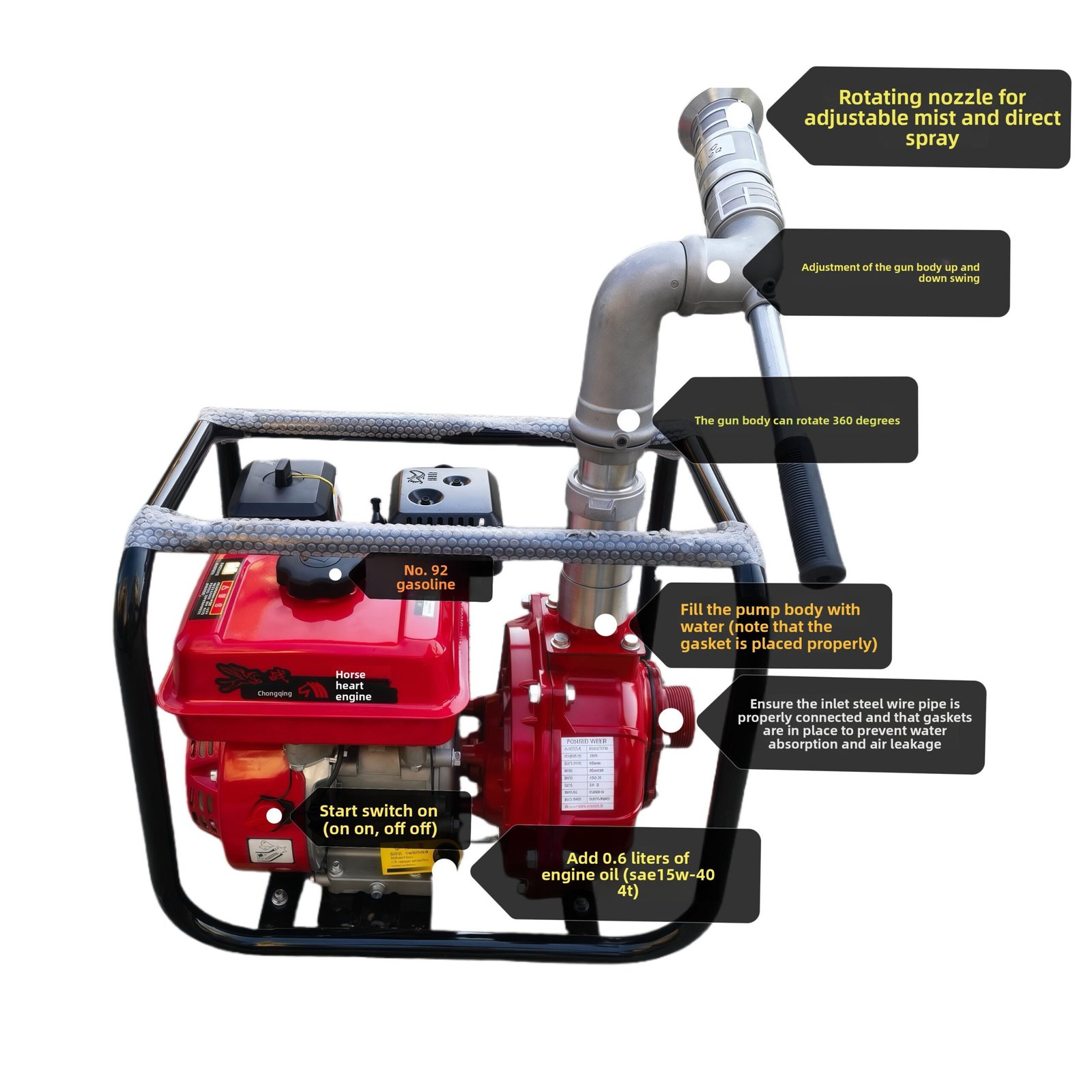 Gasoline Engine Power: This product features a compact structure, easy starting, fast water output, low fuel consumption, light weight, high pressure, and reliable operation. 9.5 hp integrated water pump, 9.5 hp integrated water pump with inlet pipe.