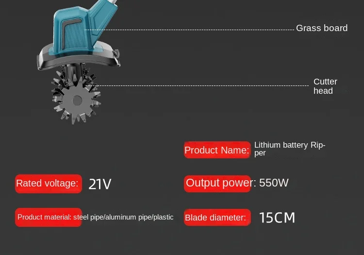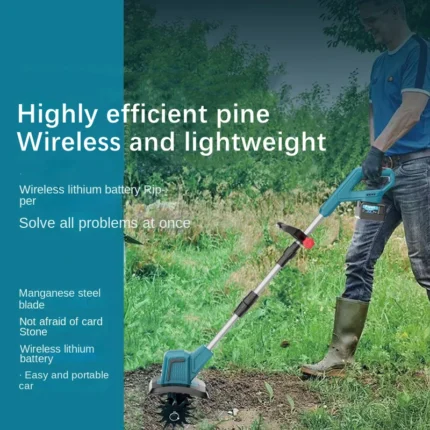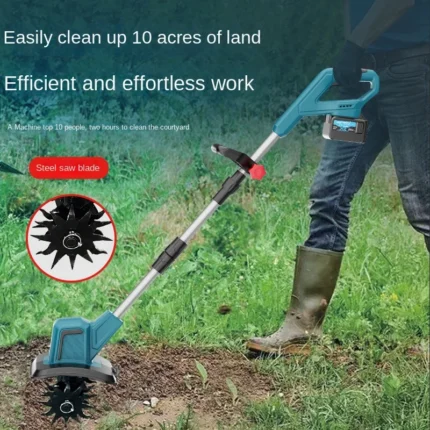 The energy-saving, fast-charging lithium battery provides a full day of use on a single charge. The machine weighs 6.5 kg and is cordless and lightweight, making it portable and flexible. It has a tillage width of 25cm, a voltage of 21V, a power of 450W, a blade diameter of 15cm, and a no-load speed of 300rpm.
