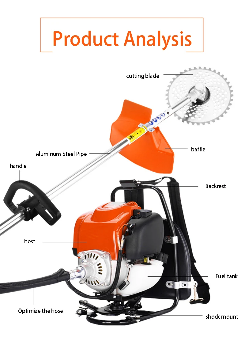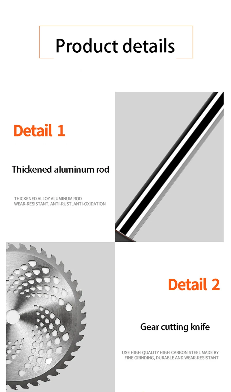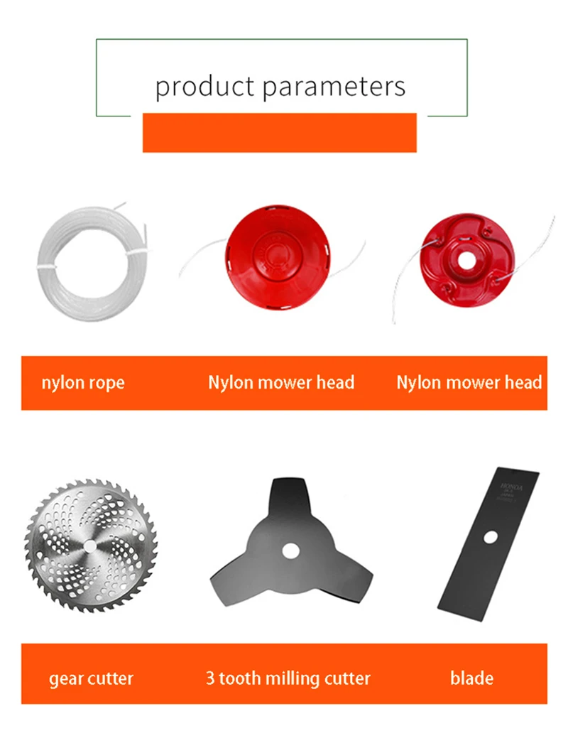 By changing the working heads, it can be used for weeding, loosening soil, ditching, harvesting rice, sawing branches, and pruning trees.