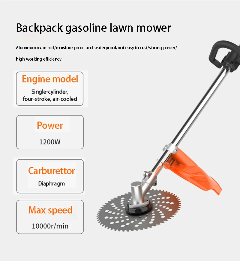 Equipped with a powerful two-stroke/four-stroke gasoline engine and sharp blades, this machine can complete 1 acre of lawn mowing in 5-7.5 hours.