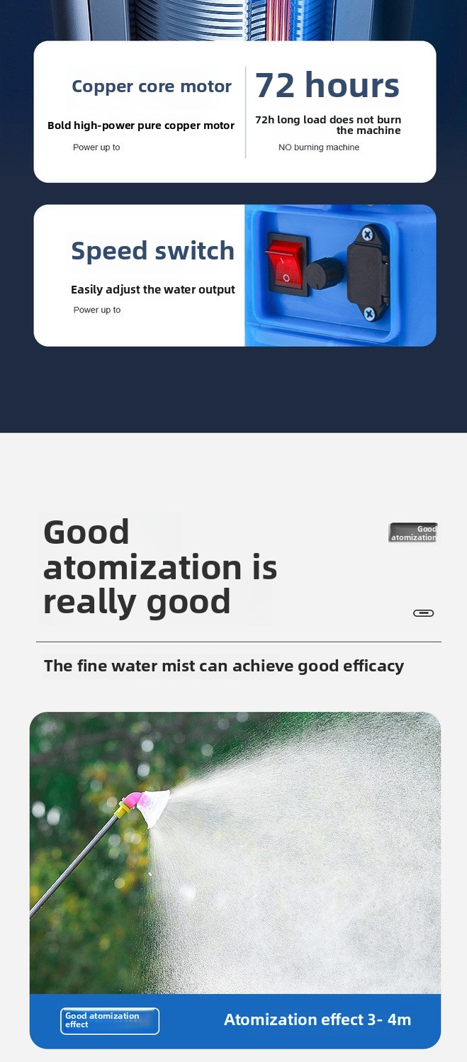 Lithium-powered sprayer: ultra-high pressure water pump lithium battery sprayer, independently adjustable and convenient three switches. Powerful spray, fine atomization, pure copper movement, long-lasting endurance, equipped with multiple nozzles with stable water pressure, suitable for various scenarios.