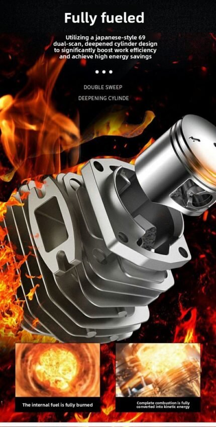 Double-sweep cylinder: Double-sweep (69) deeper cylinder, quick start, efficient cutting. The machine is made of magnesium alloy, which is labor-saving and easy to use. Hardened chain is not easy to break, and the high hardness makes it sharper and will not stick.