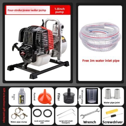 Specifications: Four-stroke, 1-inch pump, comes with a 3-meter inlet hose and a 10-meter outlet hose